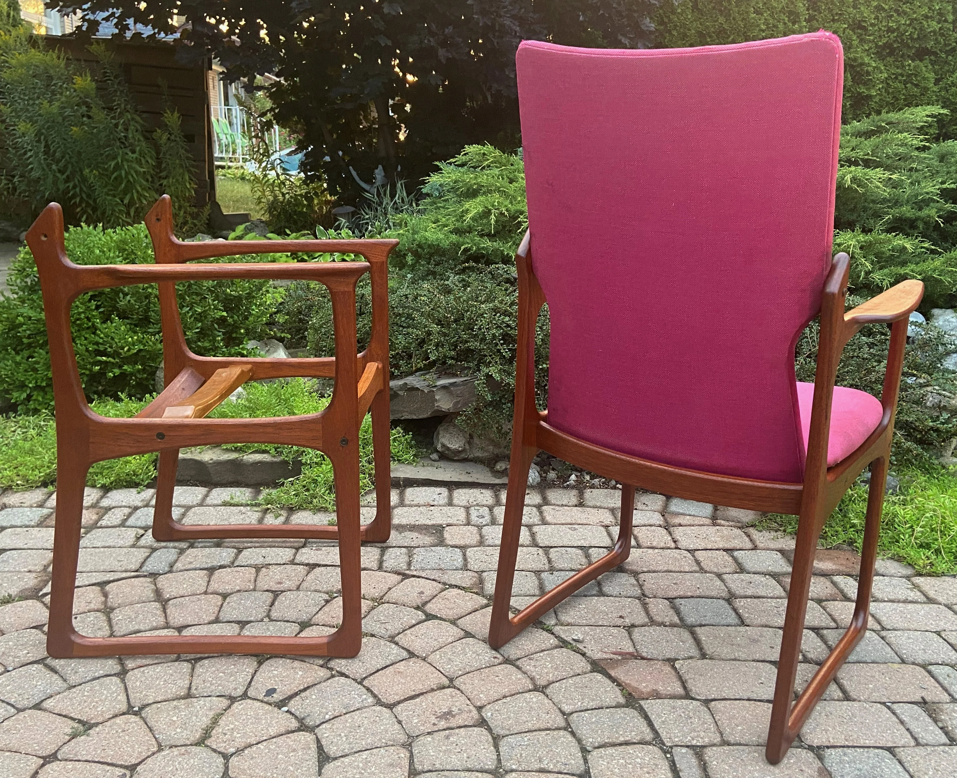 The streamlined elegance of form and function make these sculpted chairs a brilliant example of Mid-Century design. The chairs have solid teak frames with sweeping lines and VERY comfortable upholstered tufted backs and floating seats.