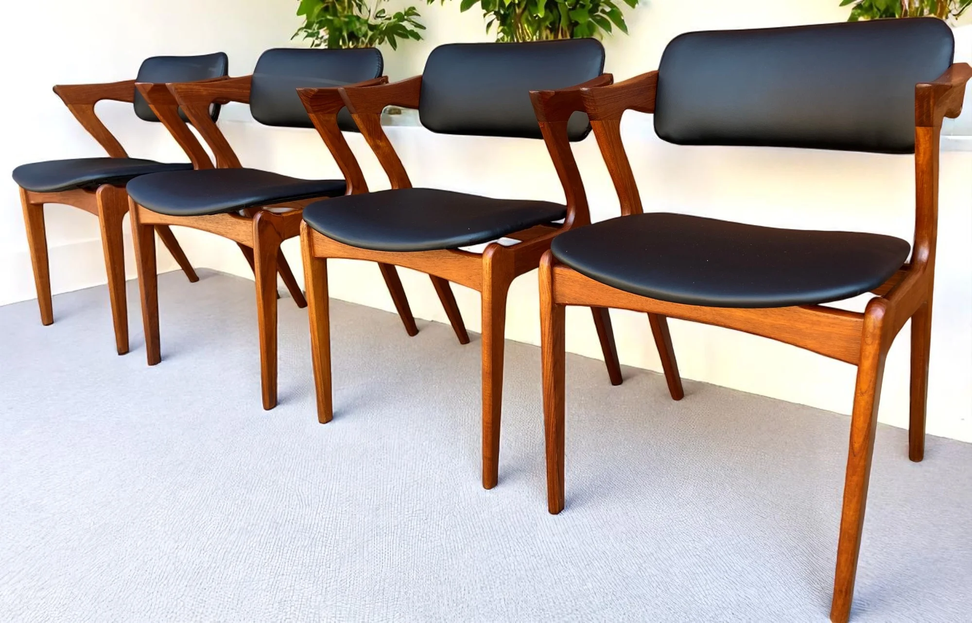 The chairs have been completely taken apart, their teak frames have been stripped, sanded and refinished to like new condition and assembled and re-glued again; we also got them professionally reupholstered in a black leather look material.