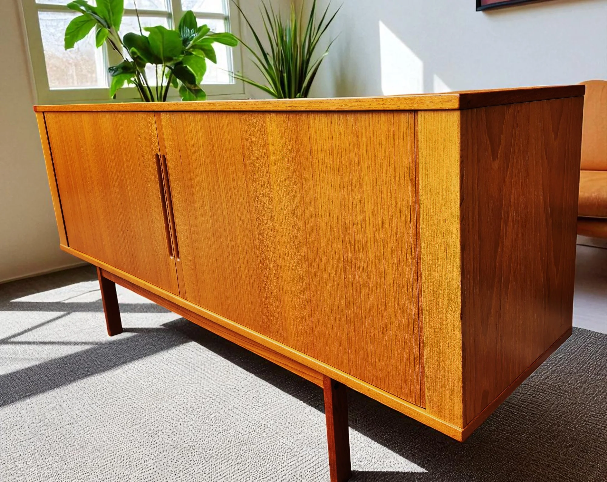 This rarely-seen vintage sideboard handcrafted of teak features 2 tambour doors that roll seamlessly into the back. The interior of this credenza is beautifully finished with adjustable shelves on each side, and one shallow felted drawer.