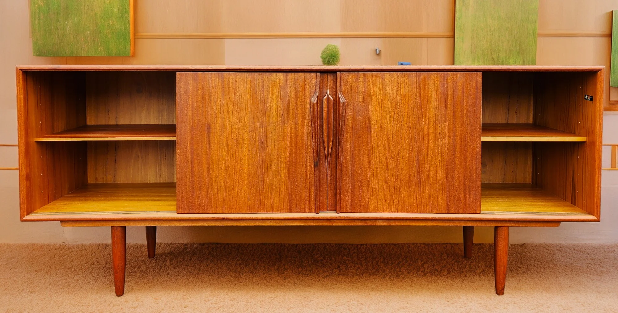 This vintage credenza features four sliding doors each with sculpted, solid teak, spear handles for a very clean and minimalist streamlined look. The doors open to reveal 3 cupboards: two small ones, one with an adjustable/ removable shelf, and another with 3 felt-lined drawers with elegant finger joinery. The third, double-sized cupboard has a single large adjustable/ removable teak shelf. The sideboard sits on large tapered, solid teak, Wegner-styled legs and has a finished back.
