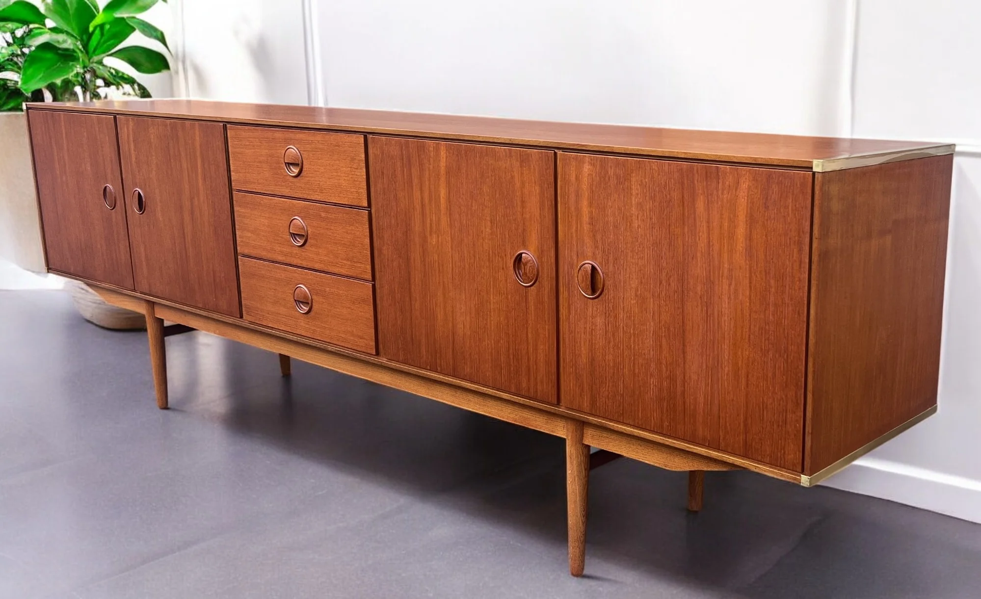 For sale, we have this stunning Dutch Mid Century Modern teak "Modulus" sideboard with brass corners designed by William Watting for Fristho furniture, Netherland ca. 1955.