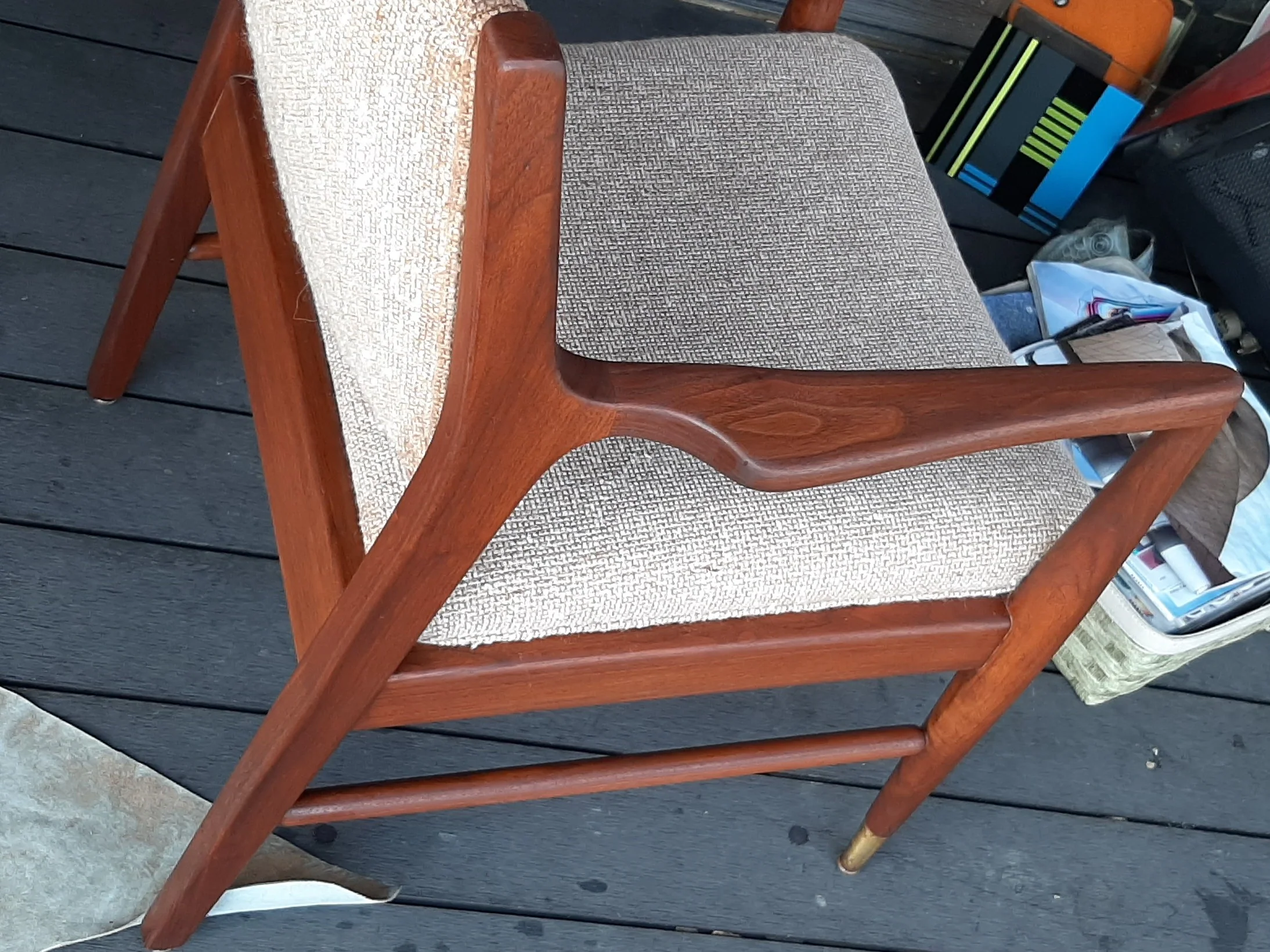 We completely stripped, sanded and refinished their walnut frames with multiple layers of Danish oil and they are ready for the custom upholstery witch we can help you with as well. Add $150 per chair for labor, new webbing and foam. You can bring your own fabric (1 metre per chair) or choose from a few that we have.